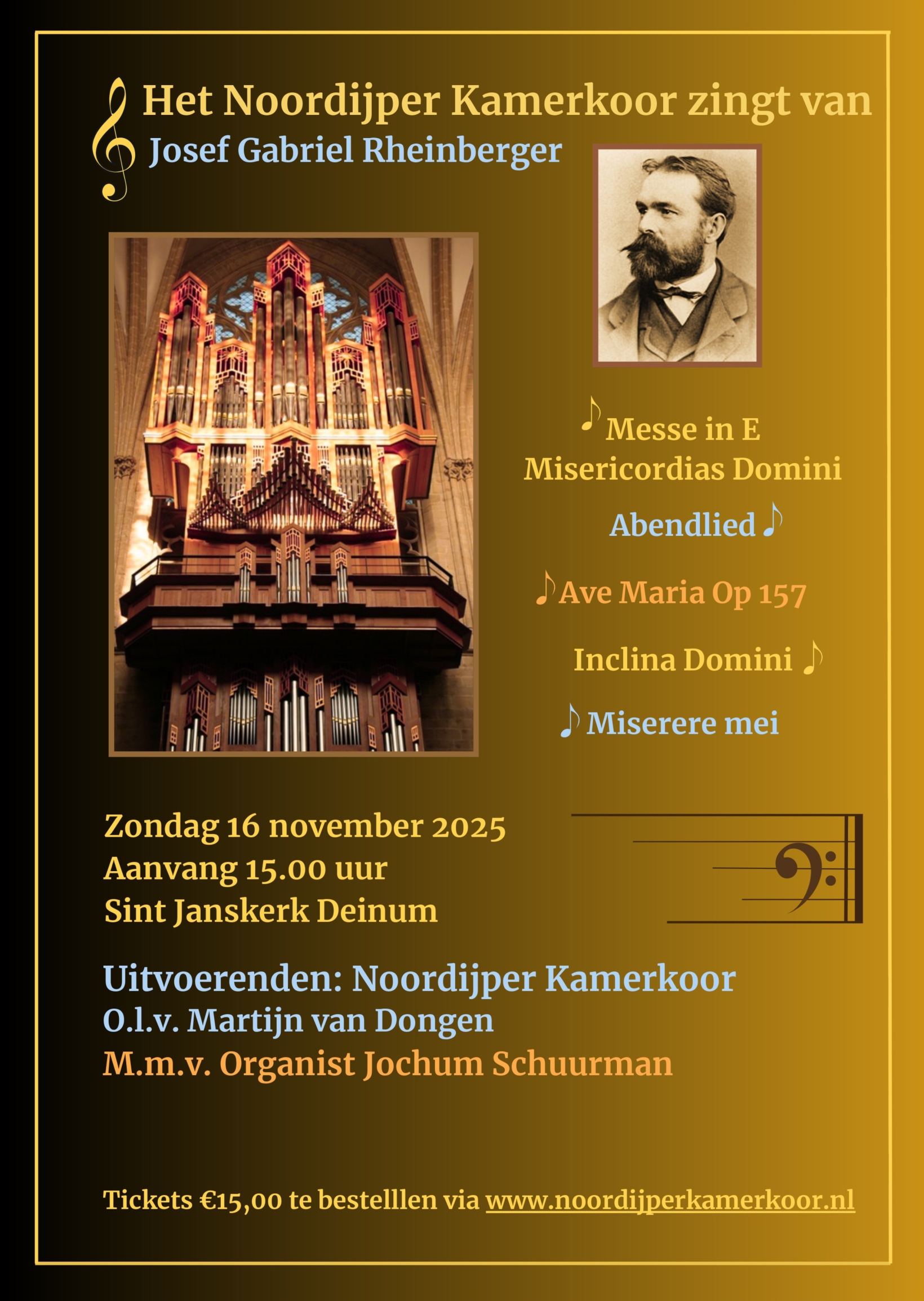 Het Noordijperkamerkoor uit Menaldum geeft 16 november een concert in de St Janskerk in Deinum. Op het programma staan werken van Joseph Gabriël Rheinberger, oa zijn Missa Misericordias (op.192) in E groot; een mis met orgelbegeleiding.