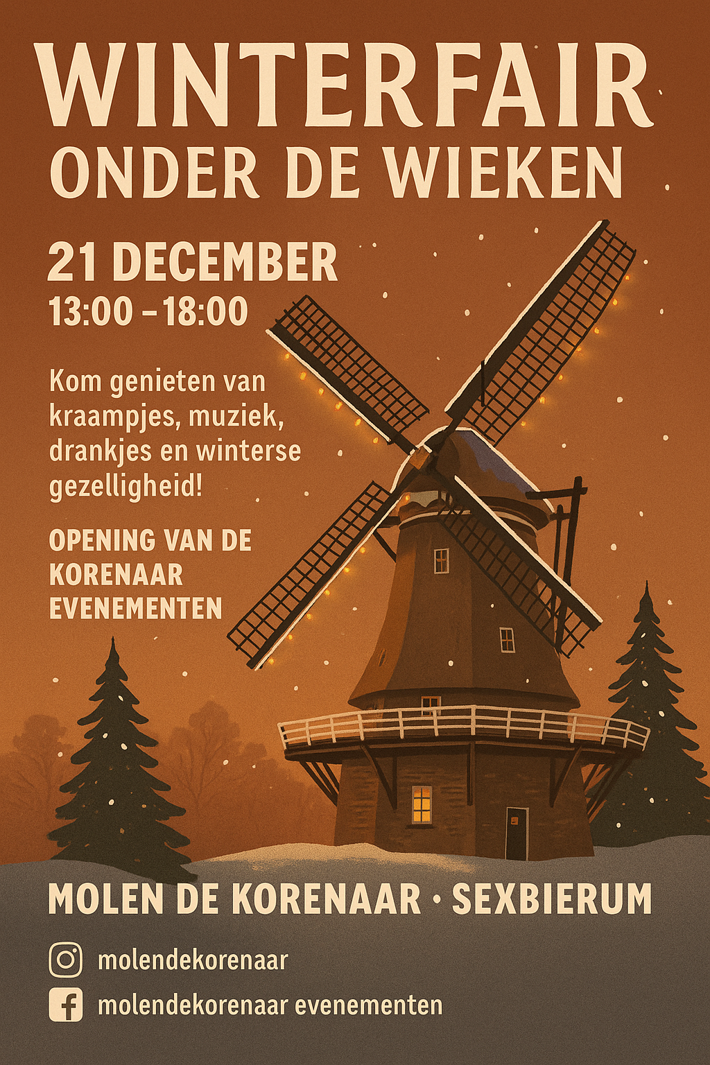 De dagen worden korter, de lucht kouder en de regen tikt tegen de ramen, de perfecte tijd om samen warmte te zoeken. Op 21 december openen we bij Molen De Korenaar in Sexbierum de deuren voor de Winterfair onder de wieken.