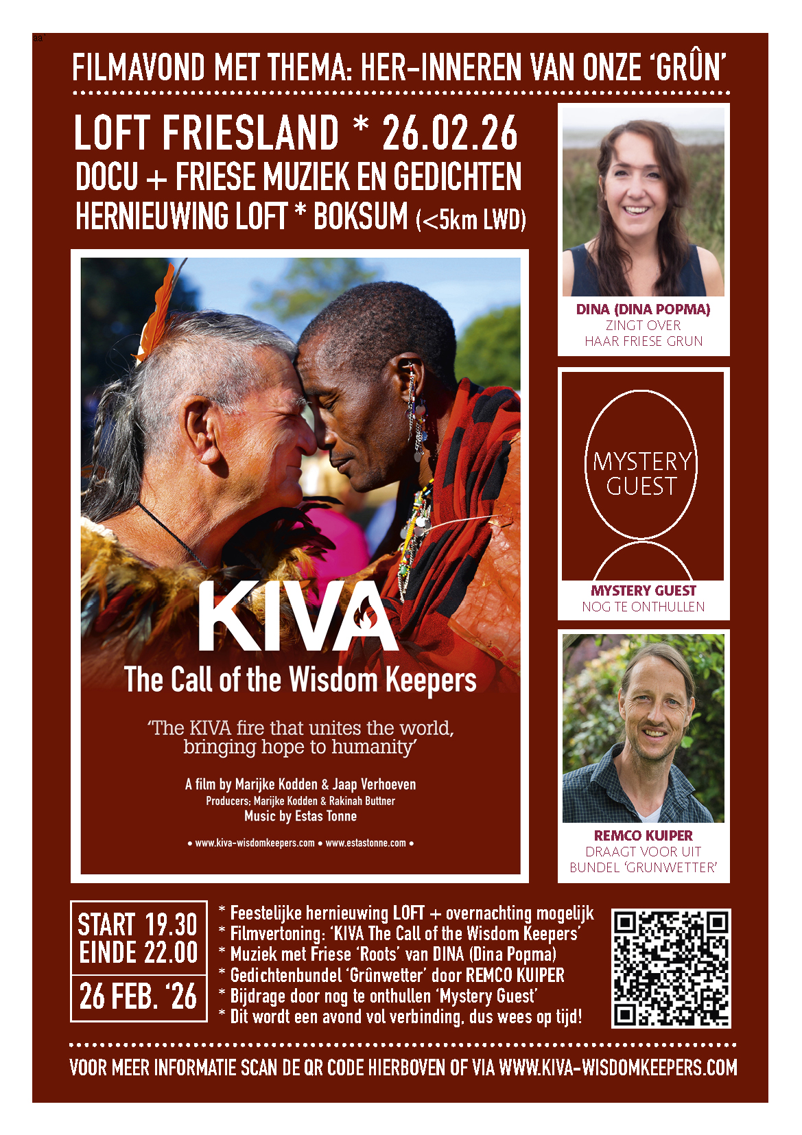 We nodigen je daarom van harte uit voor een hartverwarmende KIVA film- en sprekersavond, ter gelegenheid van de hernieuwing van LOFT FRIESLAND! Een avond vol verbinding rond de documentaire KIVA â The Call of the Wisdom Keepers. Een hoopvolle boodschap van inheemse Wisdom Keepers wereldwijd hoe we ons opnieuw kunnen verbinding met onze ‘grun’, taal, cultuur, natuur en elkaar.