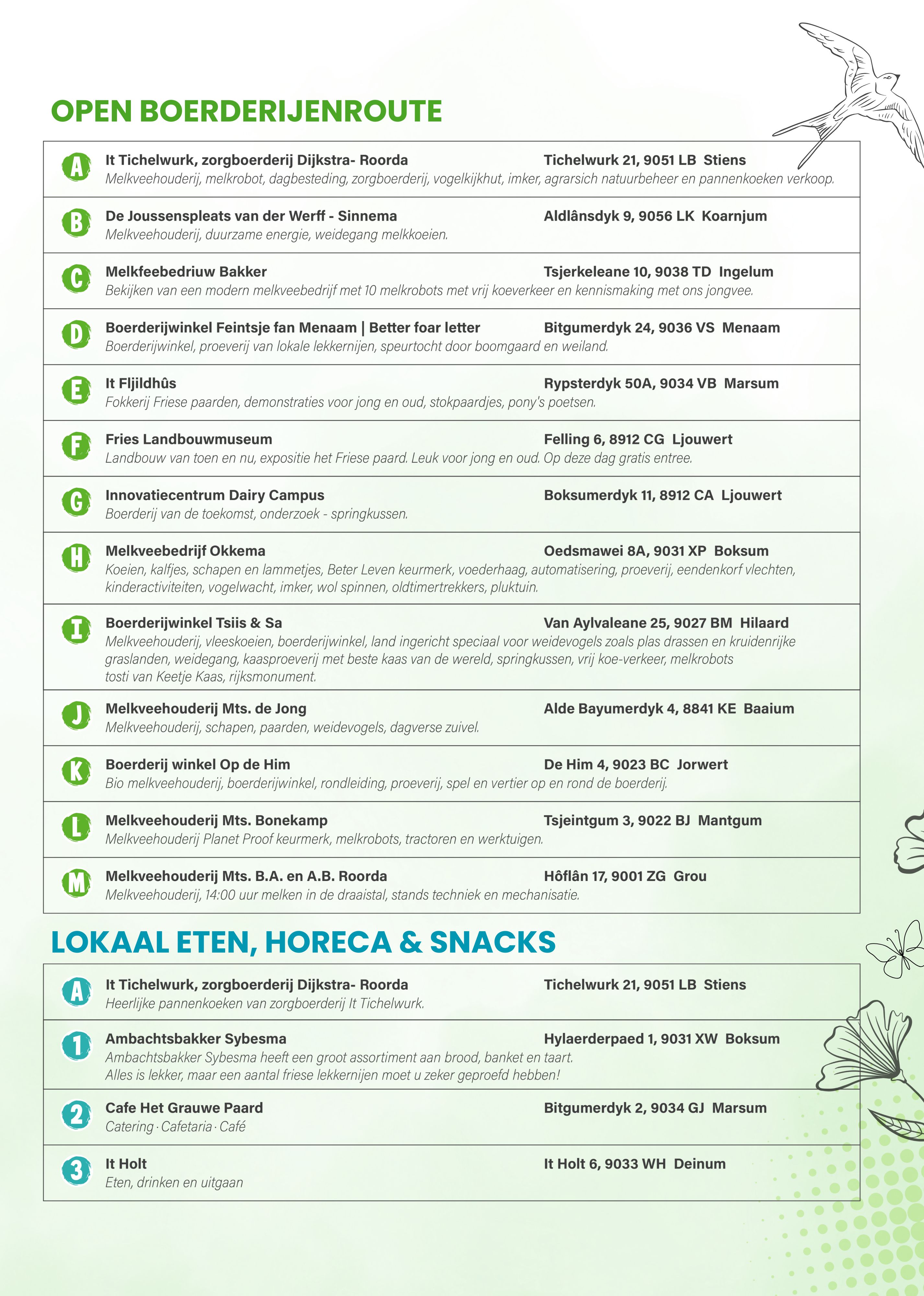 Tussen 10:00 en 16:00 uur kunnen bezoekers terecht bij 13 agrarische bedrijven in de regio. De open boerderijen dag wordt om 9:30 uur feestelijk geopend bij de melkveehouderij van de familie Dijkstra – Roorda in Stiens, waar wethouder Evert Stellingwerf van de Gemeente Leeuwarden een infobord onthult bij de nieuwe dagbestedingsruimte ‘it Tichelwurk’.